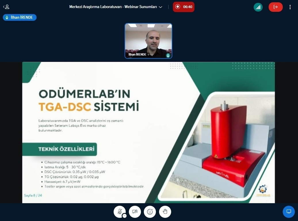 ODÜMERLAB olarak, merkezimizde yürütülen analiz hizmetlerinin tanıtımına yönelik düzenlediğimiz Bahar Seminerleri kapsamında TG-DSC Cihazı ve Uygulamaları sunumu 22 Nisan 2026 Çarşamba günü saat 14:00'te Kimya Yüksek Mühendisi İlhan İRENDE tarafından gerçekleştirildi.